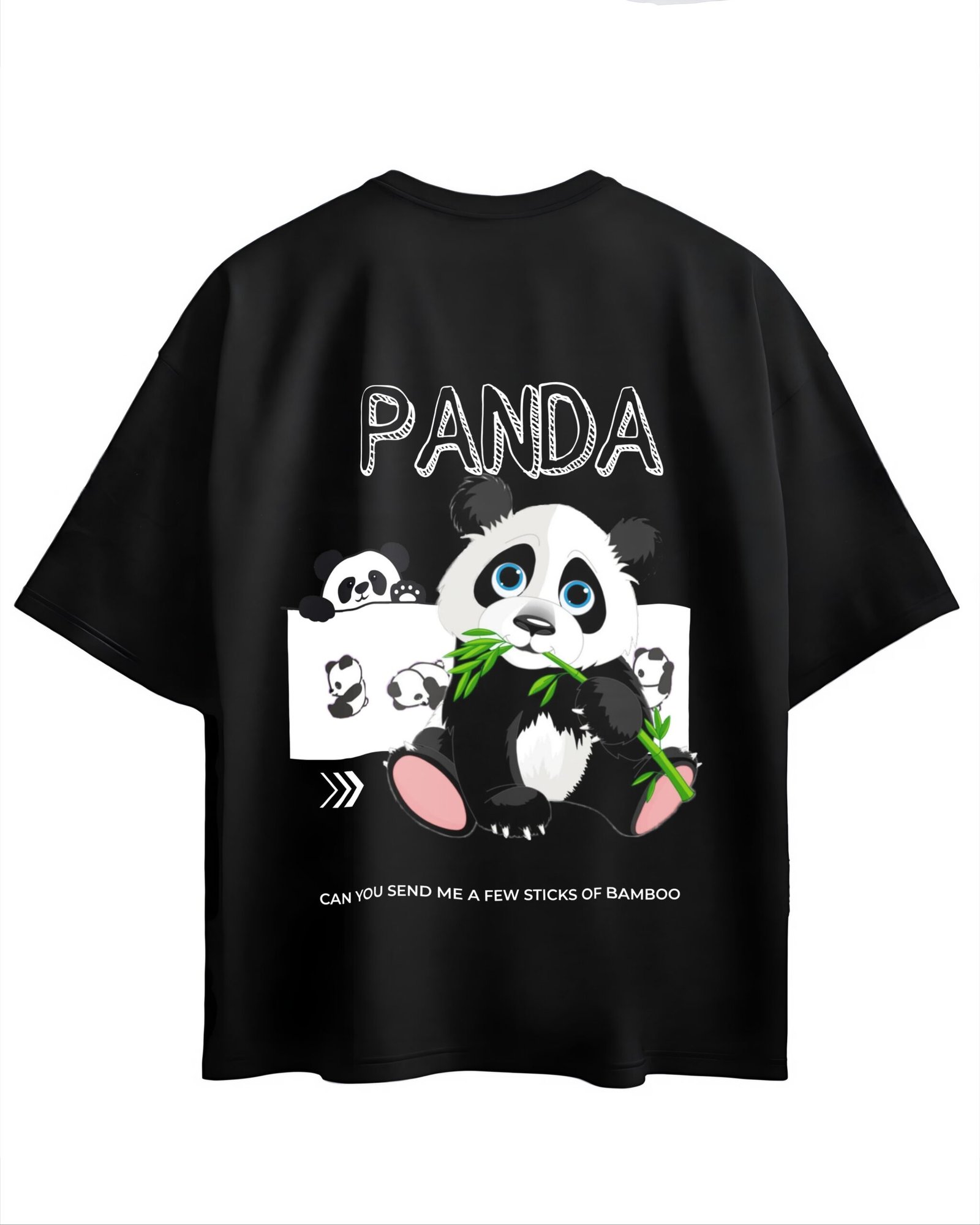 This adorable oversized black t-shirt features a playful panda graphic with bright blue eyes munching on bamboo. The design includes the bold text “PANDA” at the top and a fun caption at the bottom that reads, “Can you send me a few sticks of bamboo”. Made from soft, breathable fabric, it’s perfect for casual wear and panda lovers alike. Pair it with jeans, shorts, or joggers for a comfy, stylish look.