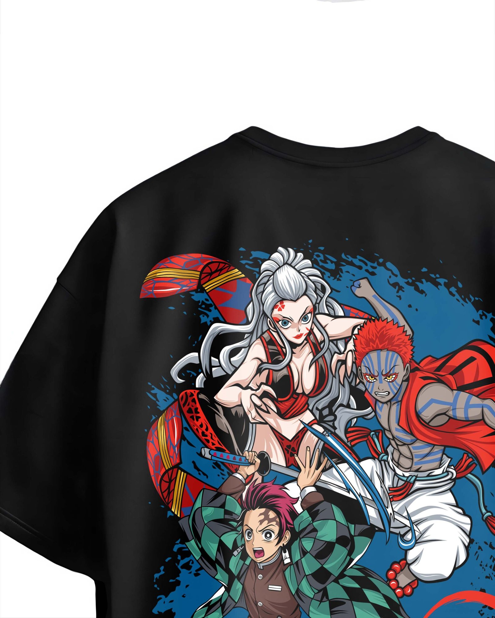 Bring the intensity of Demon Slayer to your wardrobe with this stunning Action Trio Oversized T-shirt, featuring Tanjiro, Daki, and Akaza in a powerful battle-themed illustration. The dynamic artwork pops with vibrant colors and bold detailing, making this tee a true standout for anime lovers.