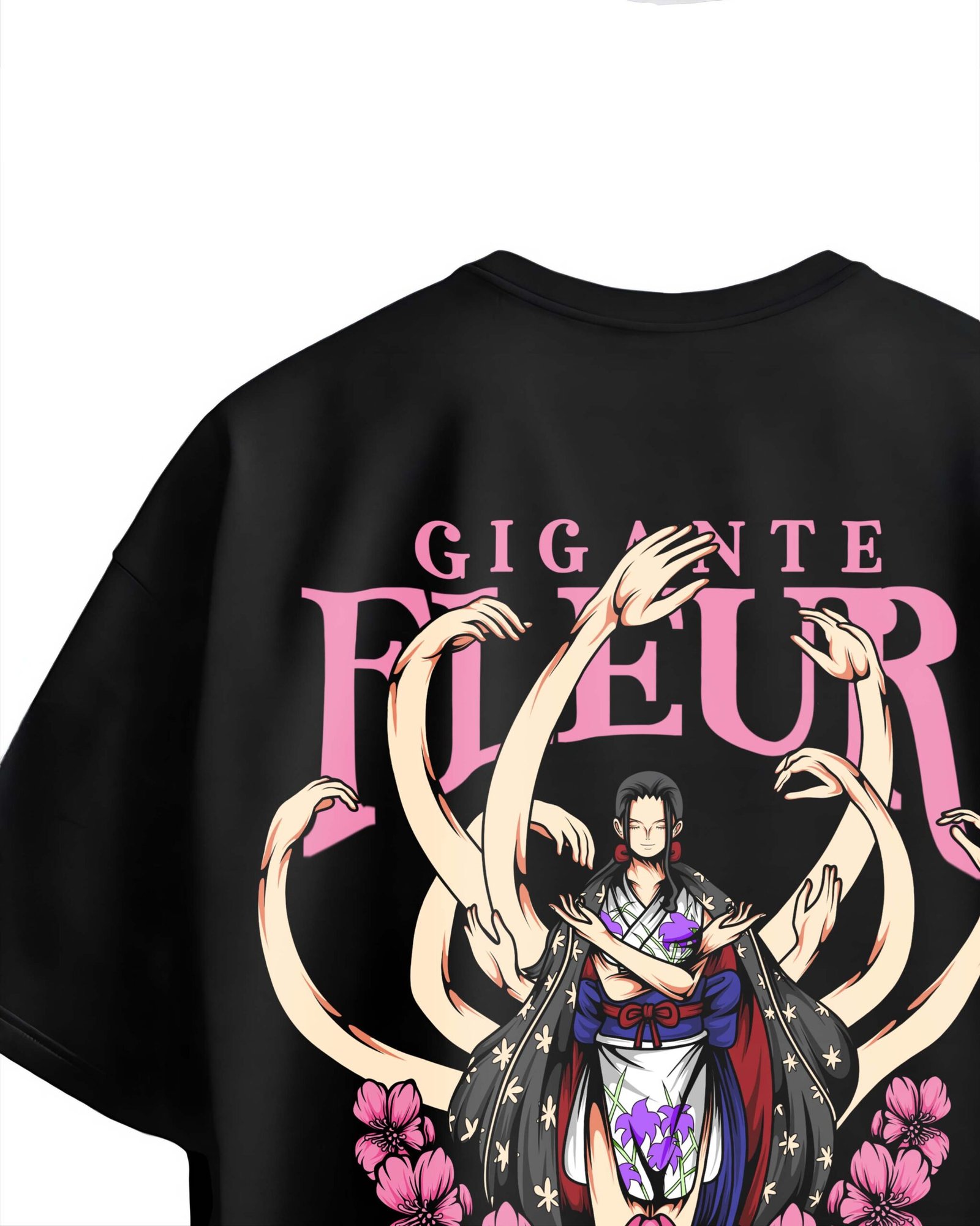 Show off your love for One Piece with this bold and artistic Gigante Fleur themed oversized T-shirt featuring Nico Robin in her iconic battle pose. The back graphic showcases Robin using her Hana-Hana no Mi powers, illustrated with multiple arms emerging like blooming flowers, surrounded by detailed pink floral artwork and striking typography.