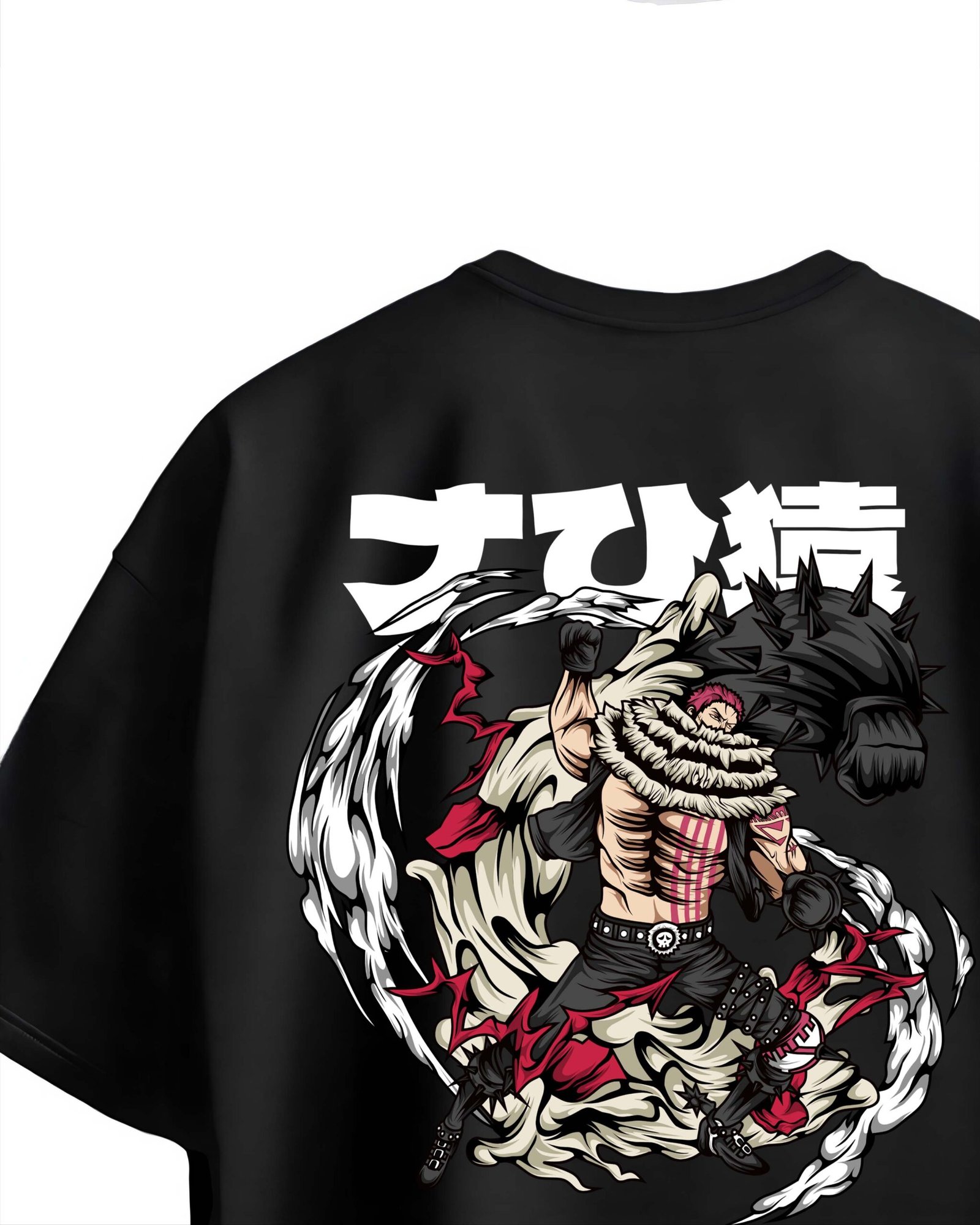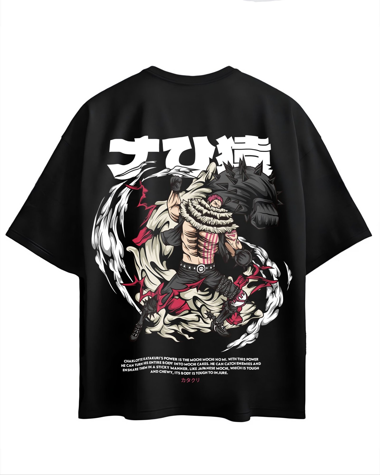 Level up your streetwear collection with this bold anime-inspired oversized black T-shirt featuring a dynamic full-back graphic of a powerful warrior surrounded by swirling energy effects. The design includes stylized Japanese text and a detailed illustration showcasing intense motion and strength. Below the artwork, a printed description highlights the character’s special “Mochi Mochi no Mi” power.