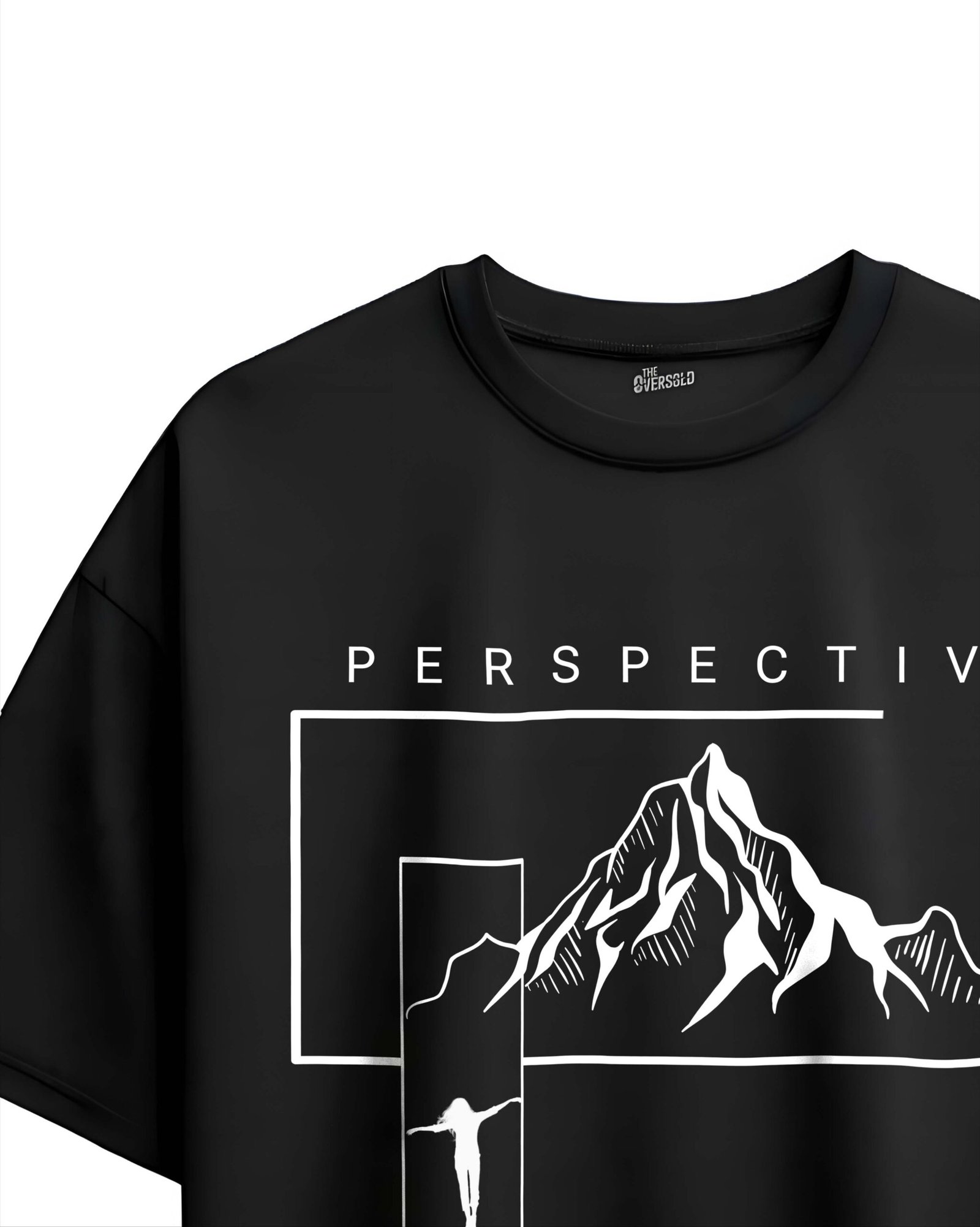 Elevate your style with this minimalist oversized black T-shirt featuring a striking white line-art mountain illustration framed with the word PERSPECTIVE. The design blends adventure and modern aesthetics, symbolizing clarity, depth, and new ways of seeing the world. Made with soft, breathable fabric, this tee offers all-day comfort and a relaxed fit perfect for casual outings, streetwear styling, or layering.