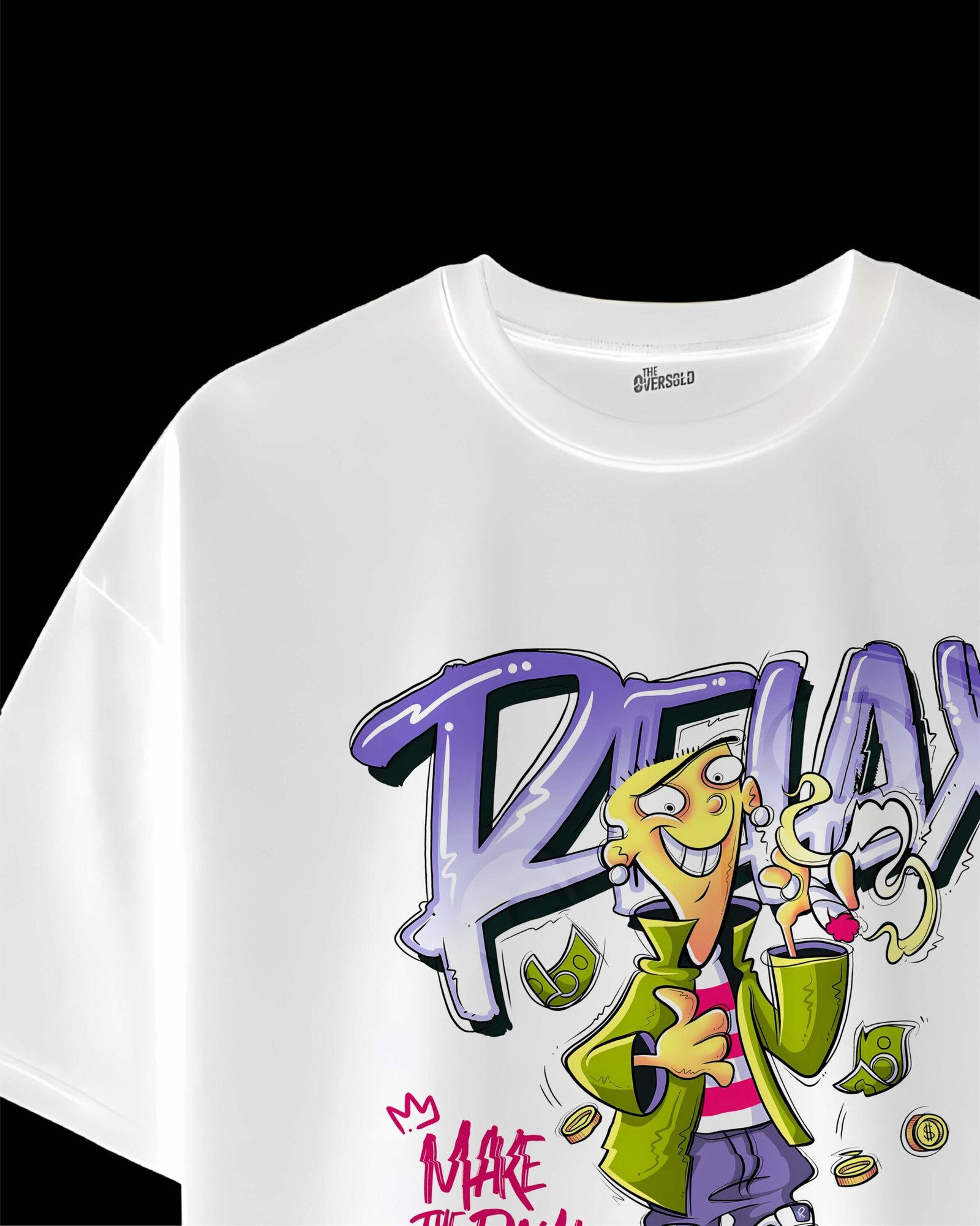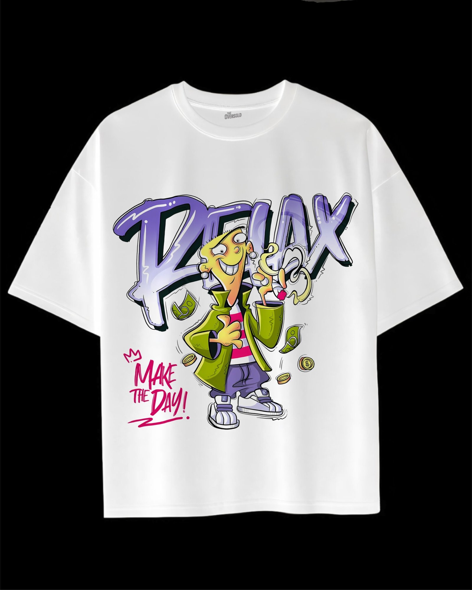 Bring laid-back vibes and playful energy to your wardrobe with this bold white oversized streetwear tee. The shirt features a colorful cartoon-inspired character design with graffiti-style text reading “RELAX” and “MAKE THE DAY!” — perfect for those who love expressive, urban fashion. Crafted from premium cotton fabric, this tee offers a relaxed fit and all-day comfort, making it a standout piece for casual outings, parties, or street-style looks.