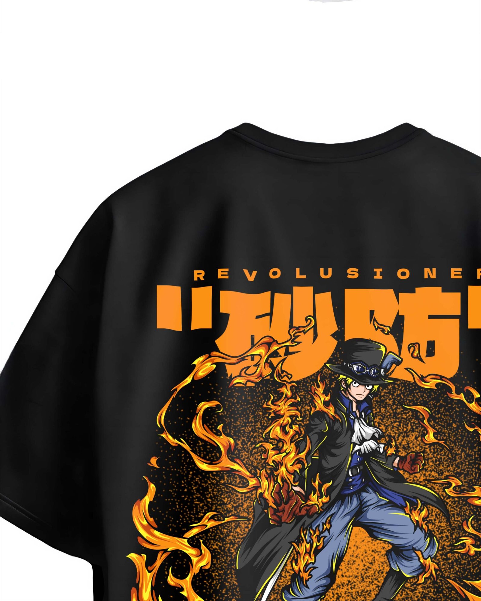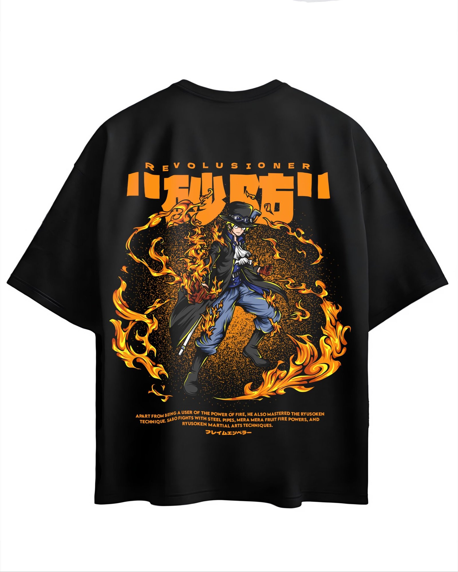 Unleash your inner fire with the Revolusioner Flame Master Graphic T-Shirt. This bold black oversized tee features a dynamic anime-inspired illustration of a fiery warrior surrounded by vibrant flames. The back print showcases striking orange text and high-detail artwork, embodying the spirit of rebellion and mastery over fire.