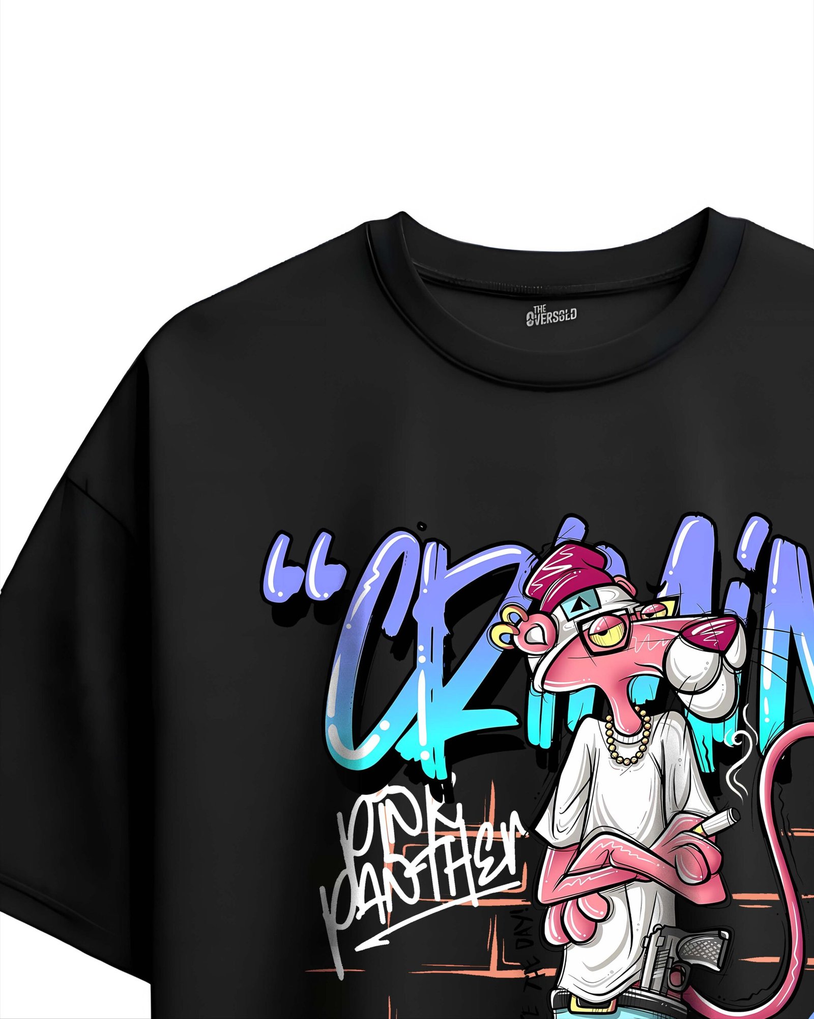 This black oversized t-shirt features a bold, graffiti-inspired design of a stylized pink panther character dressed in urban streetwear. The front graphic includes the word “CRIMINAL” in large, vibrant blue and purple lettering, with the character posing confidently against a brick wall backdrop. Made from soft, breathable fabric, this shirt blends comfort with edgy street fashion — perfect for casual wear, hip-hop outfits, or anyone who loves expressive urban art style