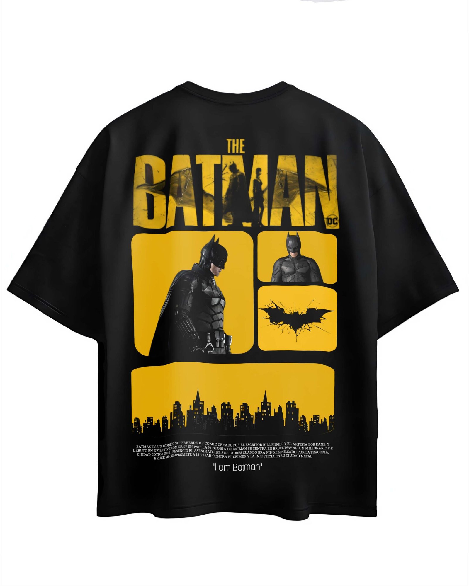 Design: Front and back print featuring Batman and Gotham City