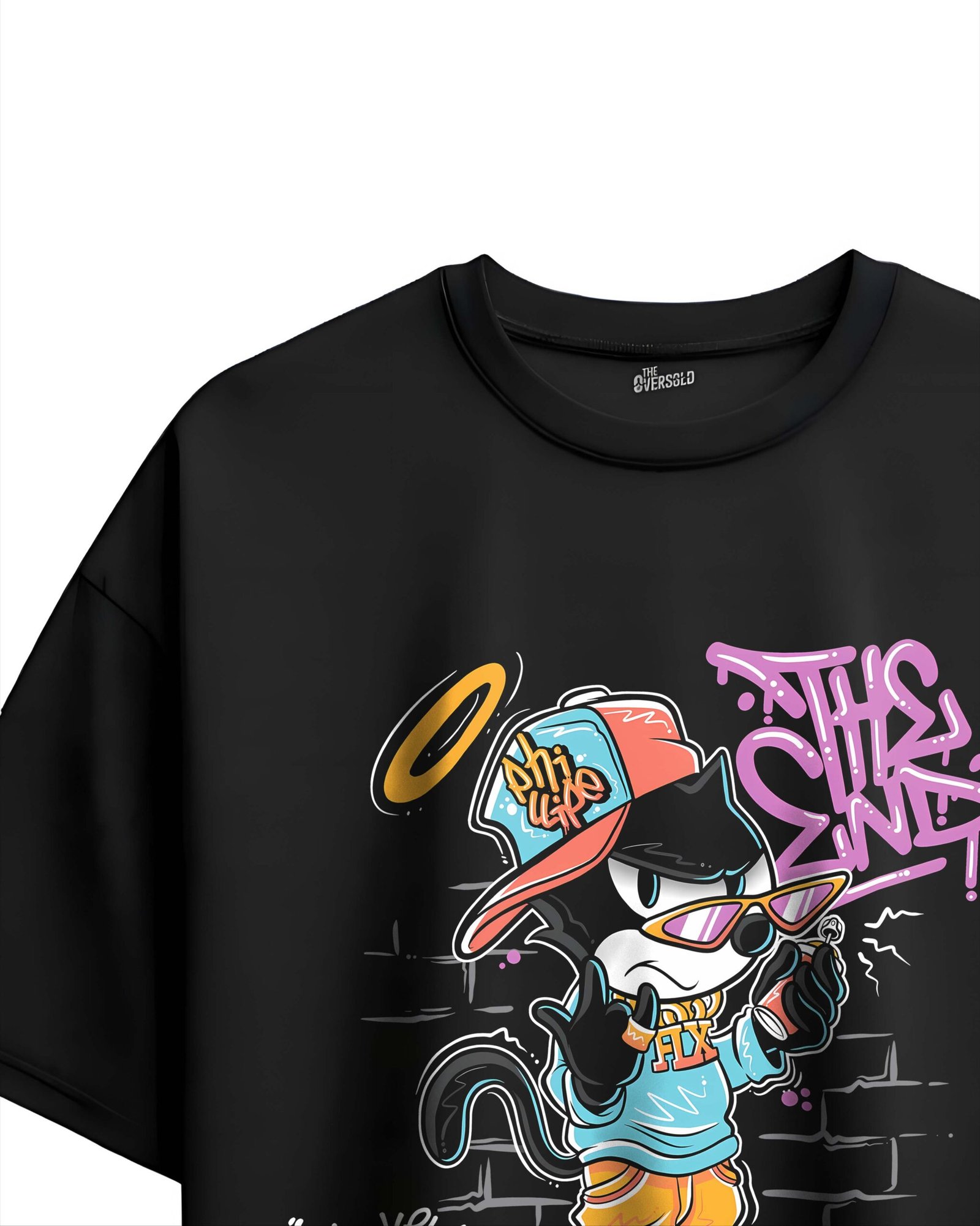 Bring the heat to your streetwear lineup with the The End Street Cat Graphic Tee. This black oversized t-shirt features a stylish cartoon cat dressed in bold urban gear — complete with a snapback hat, sunglasses, and baggy pants — surrounded by graffiti art and street-inspired text like “Make the Day!” and “The End.” The mix of bright orange, pink, and teal accents makes this tee a standout piece for anyone who loves expressive and playful street fashion.