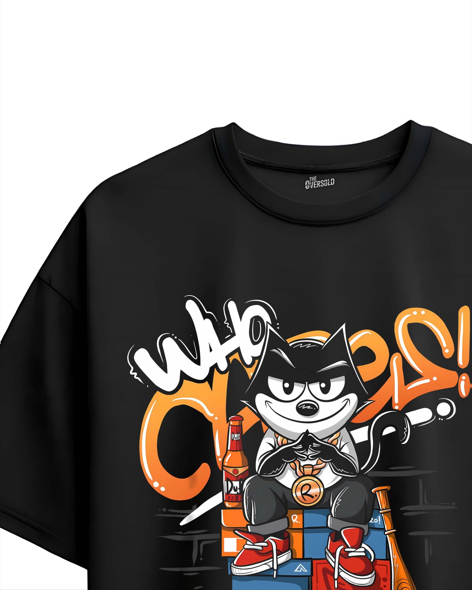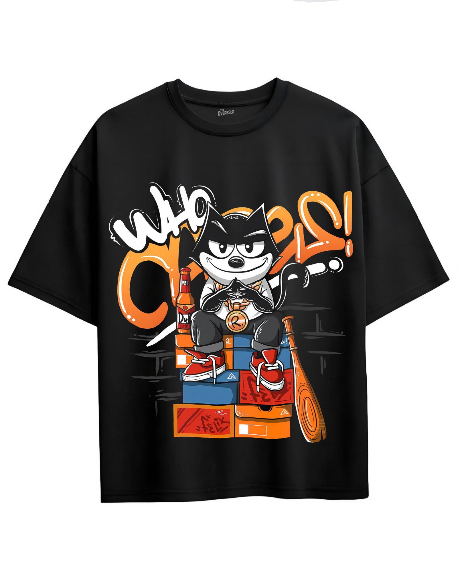 Show off your bold street attitude with the Who Cares Street Cat Graphic Tee. This oversized black t-shirt features a mischievous cartoon cat sitting on a stack of shoeboxes, surrounded by vibrant graffiti text and urban details like a baseball bat and soda bottle. The eye-catching orange, white, and red tones give it a standout, street-inspired vibe that pairs perfectly with sneakers and casual fits
